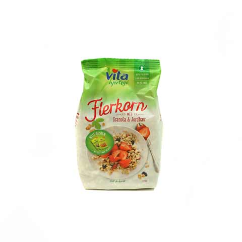 Sesamfr, rosiner, puffet quinoa (mandler, havreflak (glutenfrie). Spr granola av rug, havre, bygg, gresskarfr, kli, puffet quinoa og opphakkede dadler bakt i ovn med honning.
